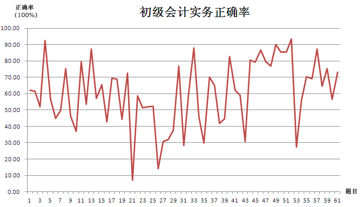 整体来说各科题目的正确率呈分散状态,一方面是初级会计考试范围广、题库出题随机性大,另一方面也反应出广大考生的备考情况,对基础知识的掌握还是不够牢固,很多考生属于连蒙带猜。
