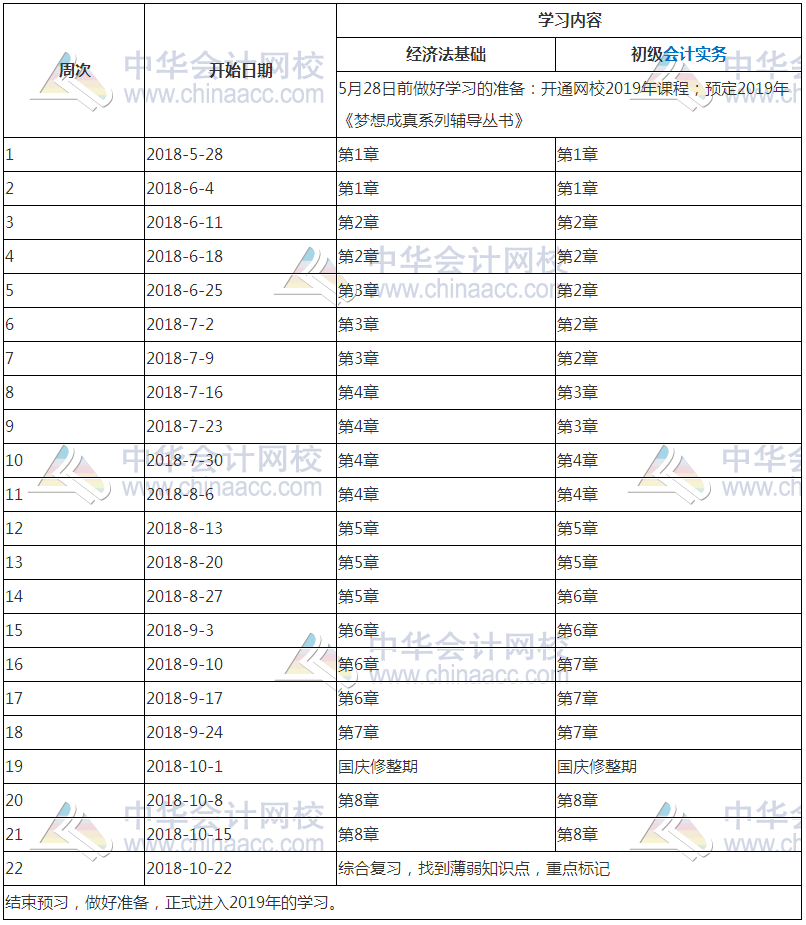 1.本计划表从2018年5月28日开始执行,计划于2018年10月29日结束,共计22周;学员可根据本表的提示,结合自己的时间安排、学习情况进行细化,并按网校要求完成听课、做题的学习任务,基本可满足考试需要。