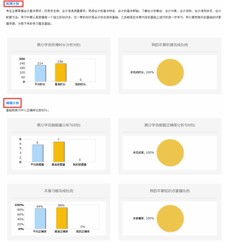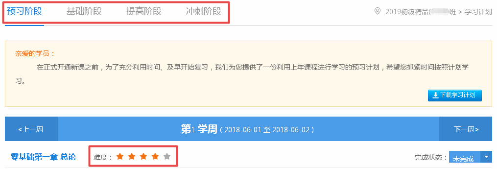 学习计划贯穿整个备考阶段:预习→基础→提高→冲刺。每个阶段分别制定学习方案,而且会按周列出具体要学习的章节和知识点,每章考试难度和学习完成状态也会一一显示。