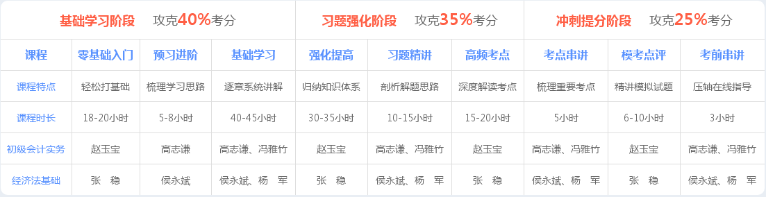 除以下课程外,还赠送机考操作及应试技巧视频和2018年初级辅导课程哦。从入门到基础、从习题到强化、从冲刺到备考,完美课程体系,帮你轻松刷到60+。更重要的是,该班次由会计界扛把子高志谦、侯永斌主讲,听过他们课的学员都说好,不信你听一听?高志谦>> 侯永斌>>