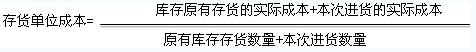 存货单位成本=[月初库存存货+∑(本月各批进货的实际单位成本×本月各批进货的数量)]÷(月初库存存货的数量+本月各批进货数量之和)