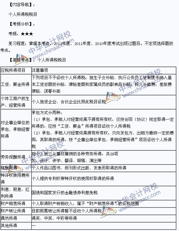 2013初级职称《经济法基础》高频考点:个人所得税税目