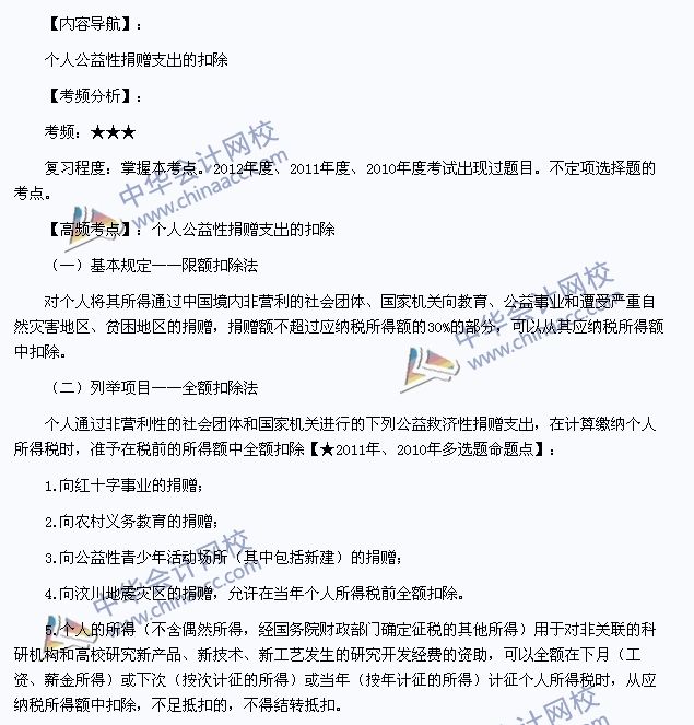 我们一起来学习2013初级会计职称考试《经济法基础》高频考点:个人公益性捐赠支出的扣除。本考点属于《经济法基础》第五章企业所得税、个人所得税法律制度第二节的内容。