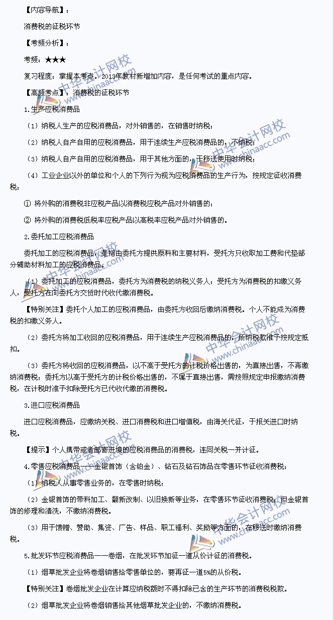 2013初级会计职称《经济法基础》高频考点:消费税的征税环节