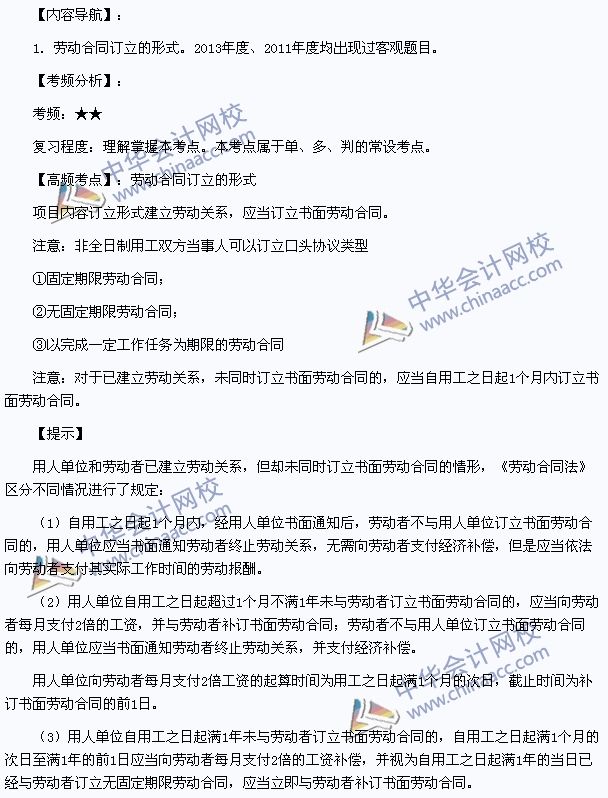 2014年初级职称《经济法基础》高频考点:劳动合同订立的形式