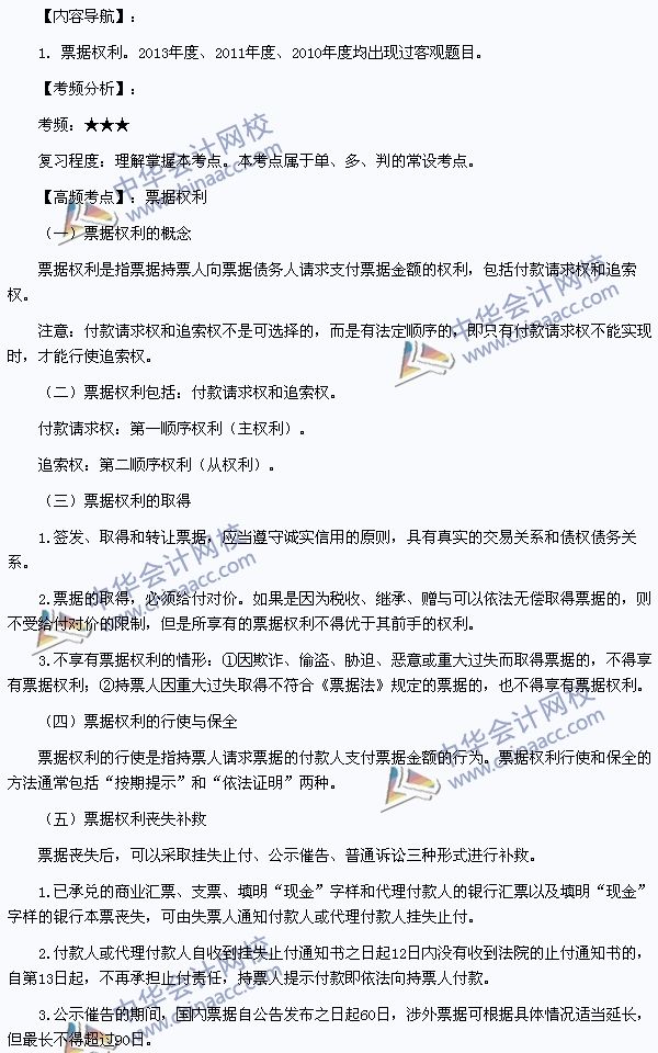2014年初级会计职称考试《经济法基础》高频考点:票据权利