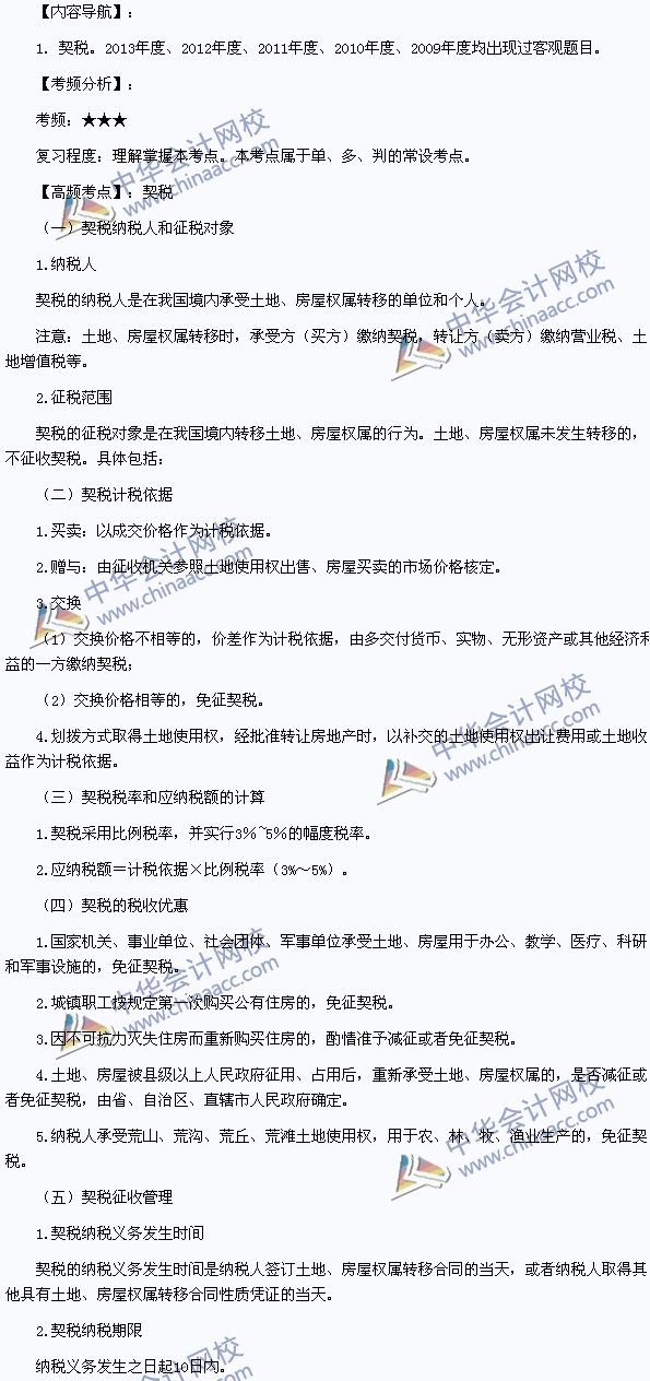 2014初级会计职称考试《经济法基础》高频考点:契税