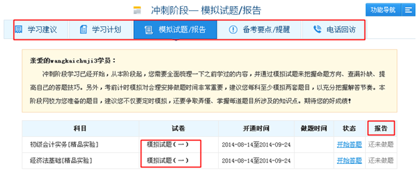 备注:选报精品班/实验班的学员通过模拟试题测试后,不仅可以查看得分情况和答案解析,系统还会根据您的得分、题目完成率、做题用时等情况为您提供一份详细的测试评估报告。另外,有专职老师梳理备考要点、预约电话回访和短消息提醒等服务帮考生准确地把握考试方向、清楚复习思路,解决学员该阶段复习迷茫、做题正确率不高的难题,确保备考。