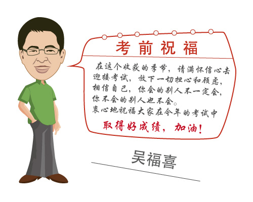 在这个收获的季节,请满怀信心去迎接考试,放下一切担心和顾虑,相信自己,你会的别人不一定会,你不会的别人也不会。衷心地祝福大家在今年的考试中取得好的成绩,加油!