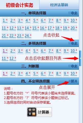 ②题目类型分为单项选择题、多项选择题、判断题、不定项选择题。红色字体为说明部分:题号右方的“*”号表示该小题还未作答,“?”号表示该小题做过标记。