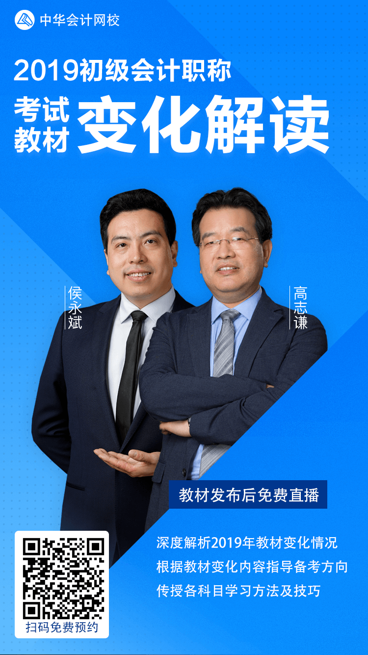 2018年财会政策频变,鉴于国地税合并、增值税税率调整、收入准则修订、新政府会计制度实行等等,2019年初级会计考试教材肯定会有所调整,具体改动会有哪些?新版教材发布后,网校会特邀老师高志谦、侯永斌为广大考生进行深入的解析,免费直播人人可参与哦!