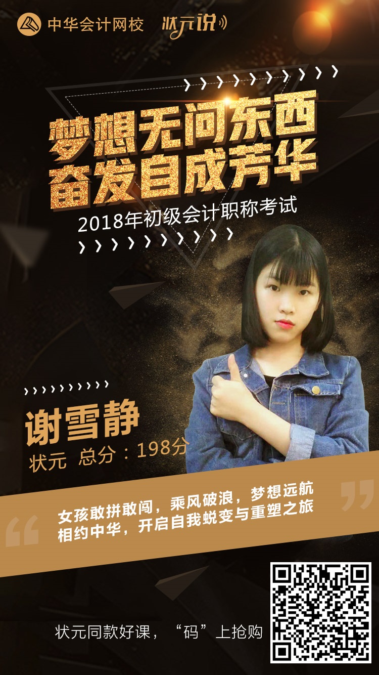 谢雪静同学在2018年度的会计初级职称考试中,取得了初级会计实务100分,经济法基础98分的优异成绩,当年飘过的小编在角落里瑟瑟发抖,当然一切的成功都不是一蹴而就的,雪静同学今天的成绩离不开她一年来的的努力,她一直以“明确目标,排除杂念,想做的事情就认真就执行,然后梦想成真”来当做自己的座右铭,雪静同学在状元说的颁奖典礼上分享了她的学习心得,下面让我们一起来看看她分享了哪些学习的好方法,相信一定会对即将要考试的小伙伴们有一些启发。