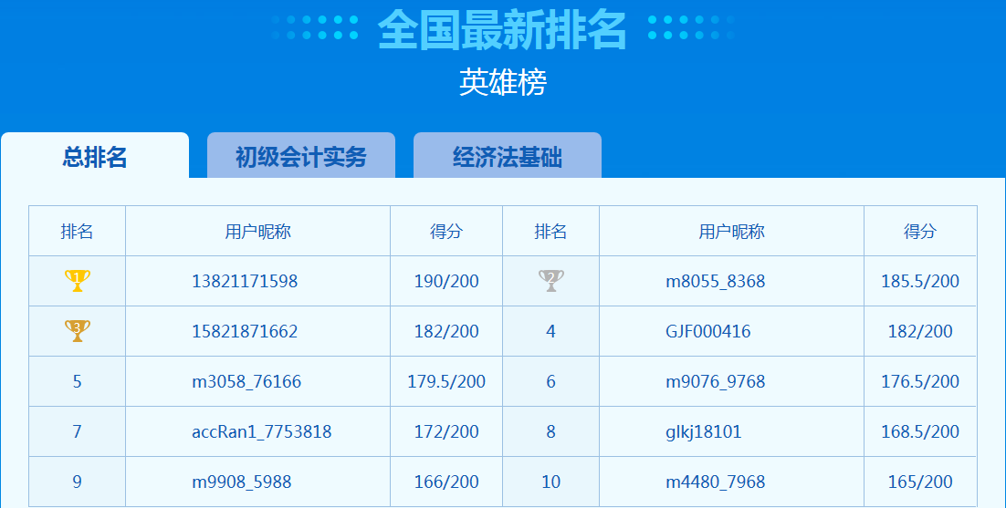 我们可以看到昵称为m2339-8366的用户,以96.5的高分夺得了初级会计实务英雄榜第一!而总排名第一的用户以95分排在第三!让我们一起看一下经济法英雄榜吧!