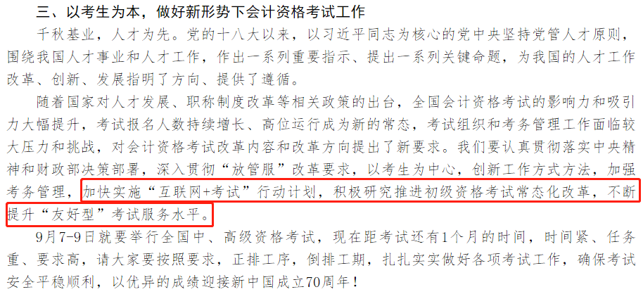 财政部会计资格评价中心党委委员、副主任胡敏杰在2019年度全国会计专业技术资格考试系统培训班上的讲话中提出“我们要认真贯彻落实中央精神和财政部决策部署,深入贯彻“放管服”改革要求,以考生为中心,创新工作方式方法,加强考务管理,加快实施“互联网+考试”行动计划,积极研究推进初级资格考试常态化改革,不断提升“友好型”考试服务水平。”
