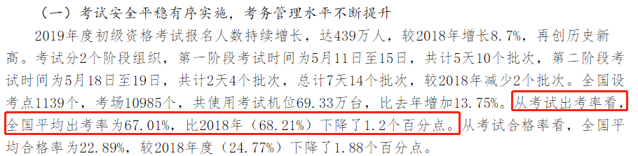 2019年度初级资格考试报名人数持续增长,达439万人,较2018年增长8.7%,再创历史新高。从考试出考率看,全国平均出考率为67.01%,比2018年(68.21%)下降了1.2个百分点。从考试合格率看,全国平均合格率为22.89%,较2018年度(24.77%)下降了1.88个百分点。