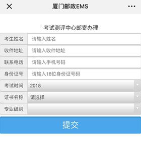 2009年度以后,凡在厦门市人事考试测评中心报名并考取的几类国家职业资格证书(名单见附件一),均可申请委托快递邮寄服务(EMS)业务。