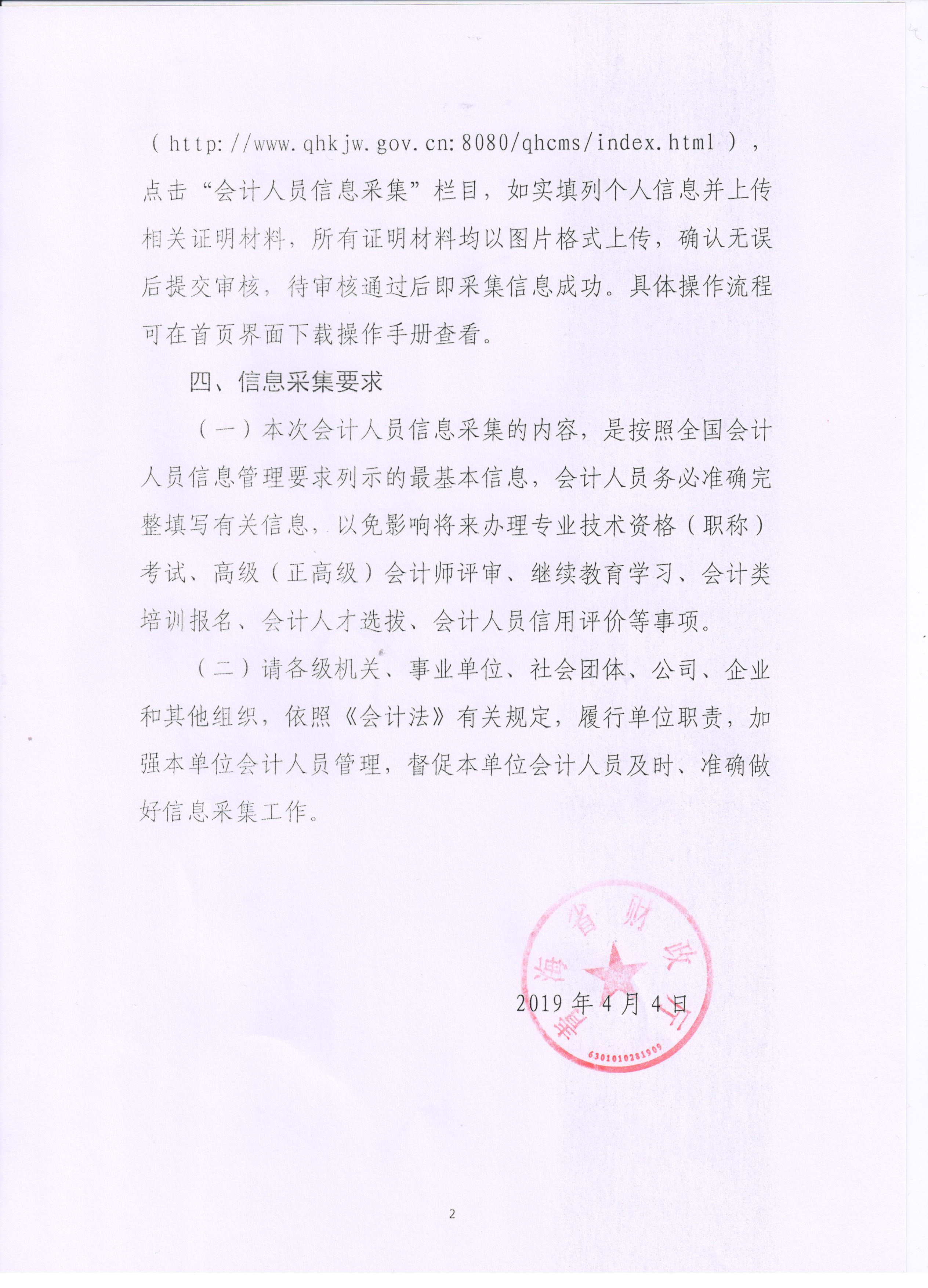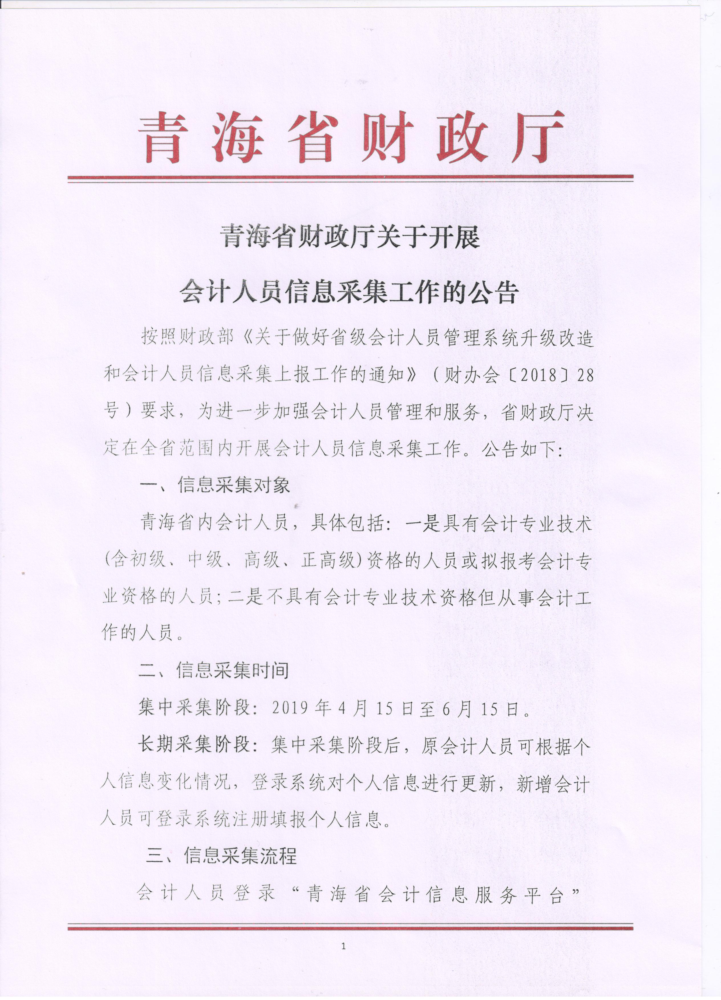 青海省会计信息服务平台2019年4月4日发布《青海省财政厅开展会计人员信息采集工作的公告》,信息采集工作将在2019年4月15日开始,请相关人员及时参加,以下为详情: