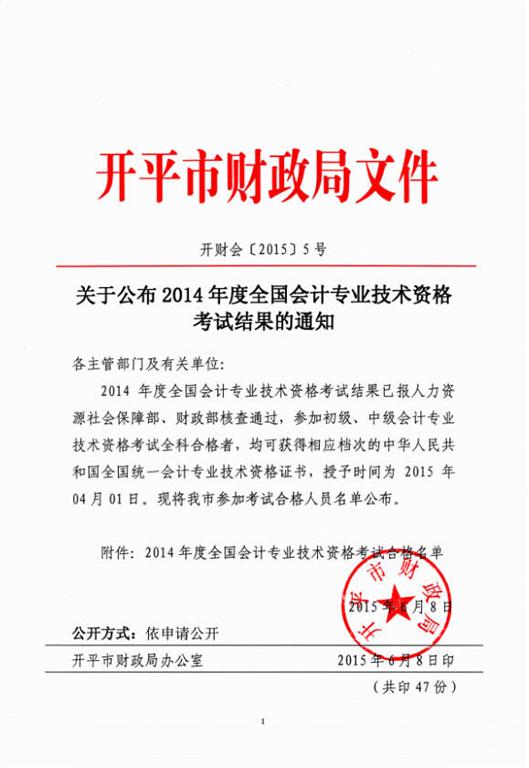 附件:关于公布2014年度全国会计专业技术资格考试结果的通知
