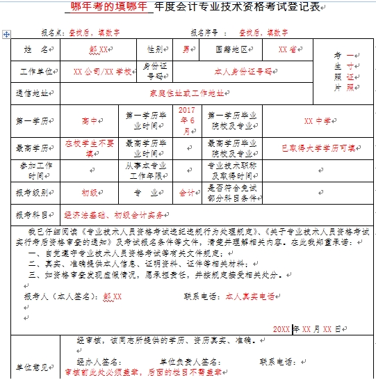 注:样表仅供参考,请合格考生根据实际情况认真填写,必须用A4纸双面打印并盖章,样表空白部分可不填,已取得大学学历考生可以在最高学历栏填写,表格盖章后不知道填写的可以到现场填写。(可多带几张盖了章的登记表,到现场备用)