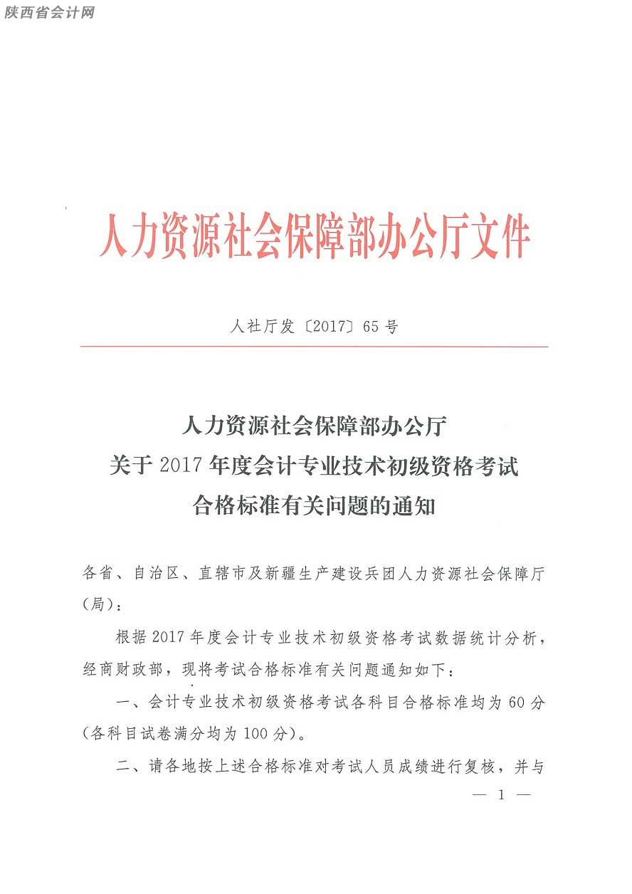 人力资源社会保障部办公厅关于2017年度会计专业技术初级资格考试合格标准有关问题的通知