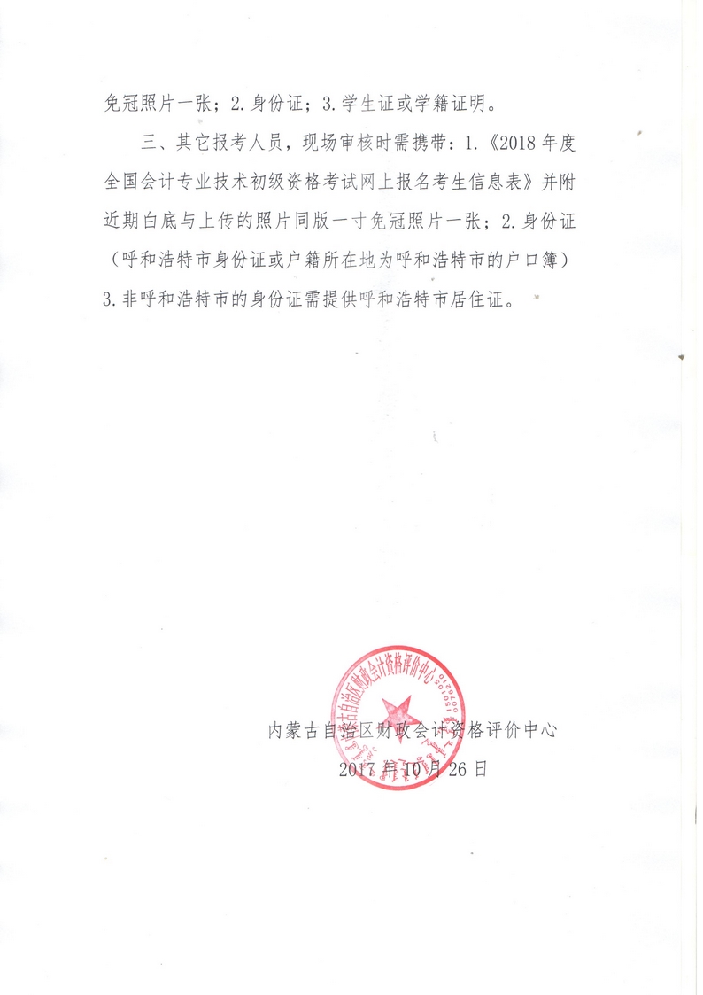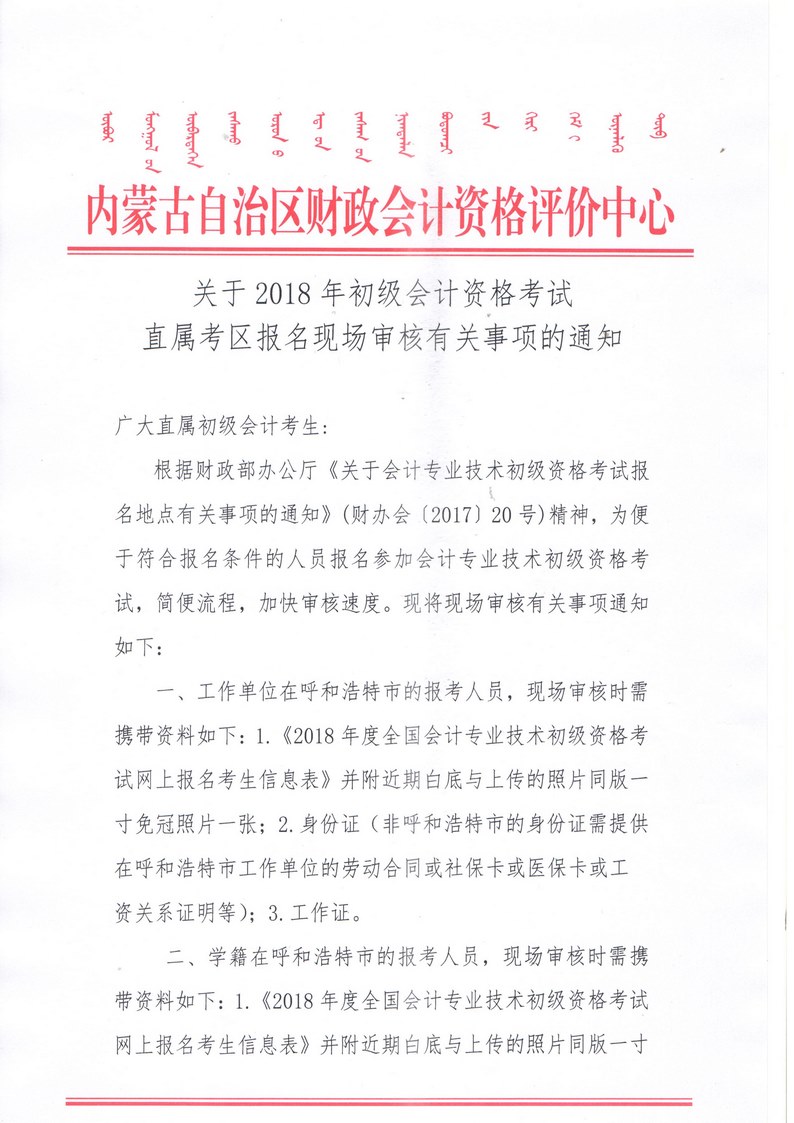 关于2018年度初级会计专业技术资格考试自治区直属考区报名现场审核有关事项的通知