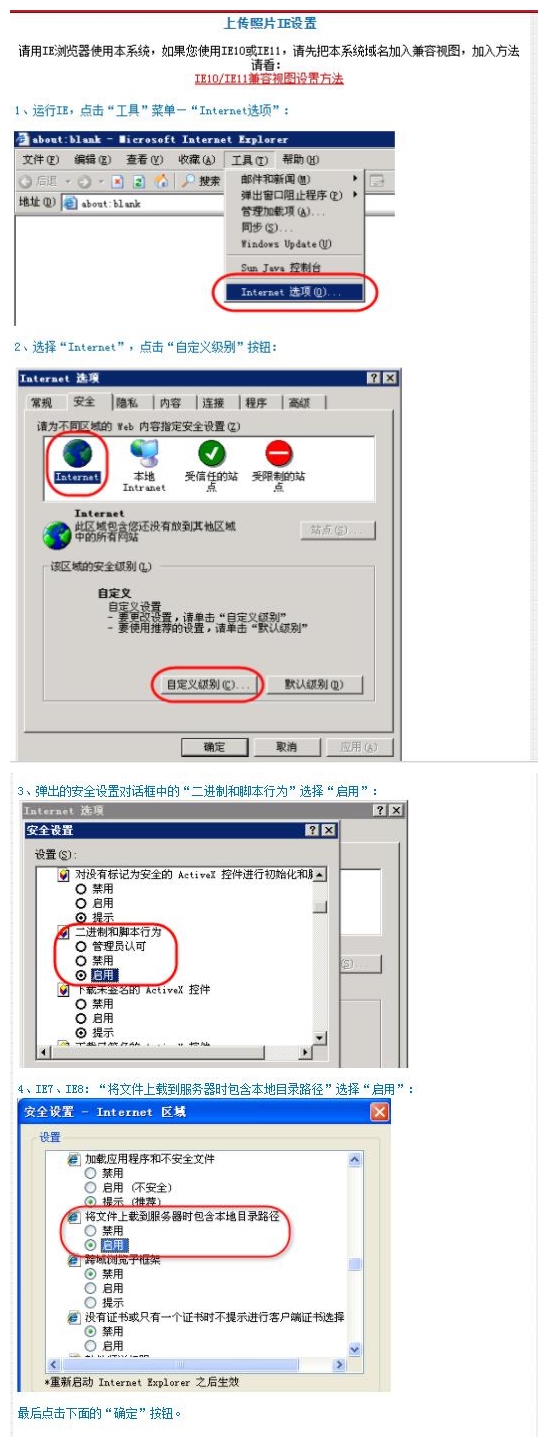 1、请先注意修改IE的安全设置:上传照片IE设置