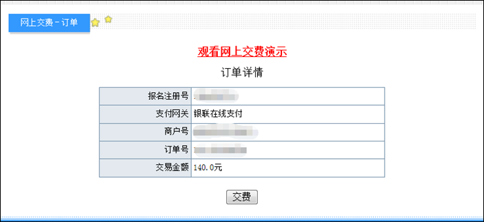 (3)点击“网上交费”进入支付页面,会再次列出考生需支付的详细清单,勾选上银联在线支付后点击“生成订单”按键。