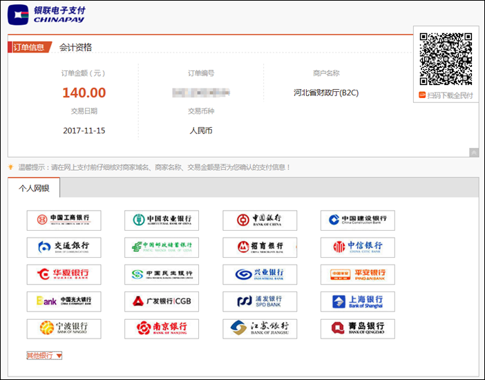 (5)弹框阅读完关闭后,进入银联支付页面,考生可自行选择银行进行支付。