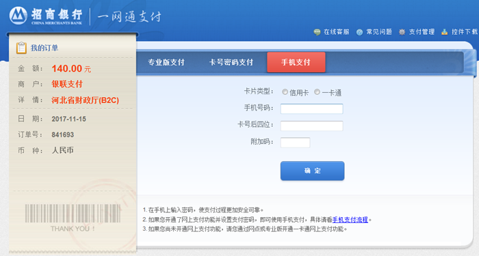 (6)以招商银行为例,进入招商银行一网通支付页面后,考生选择好支付方式就可以顺利交费了。