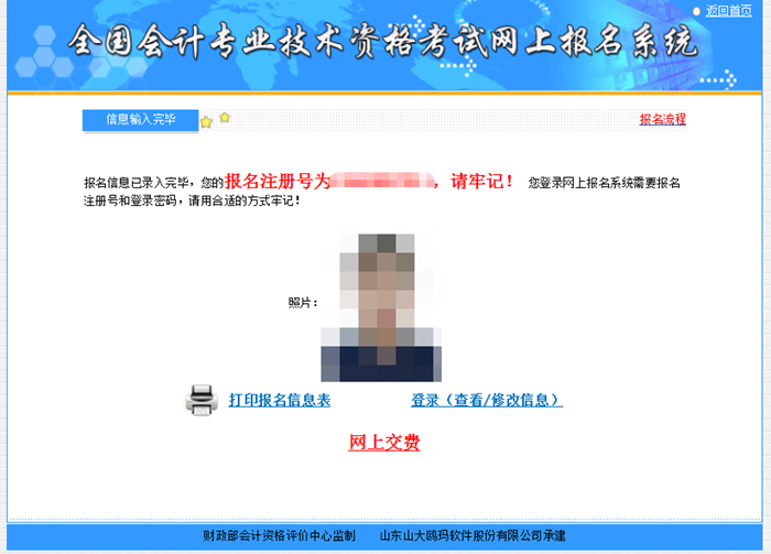(2)支付金额确认无误后,即可完成报名流程,系统此时会给出考生的报名注册号,并提供支付入口。