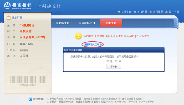 (7)如果考生在银行支付页面出现下类问题,可以联系银行进行咨询。