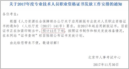 初级会计职称合格证一般在考后两个月左右开始领取,但各地区领取时间有所差异。北京市暂时还没有公布具体的2017年初级会计证领取时间,但北京市人事考试网发布公告称:自2017年起启用新版证书,目前证书正在加紧印制当中,预计12月下旬公布证书发放计划。如有领取消息网校会第一时间公布,敬请关注:各地2017年初级会计职称考试合格证领取通知汇总。