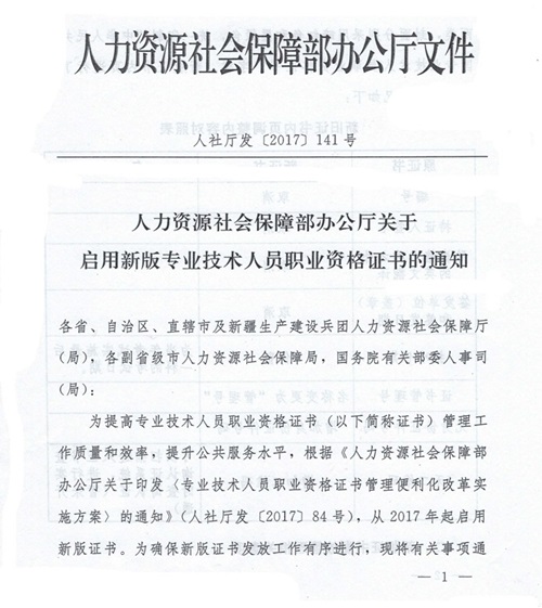 人力资源社会保障部办公厅关于启用新版专业技术人员资格证书的通知