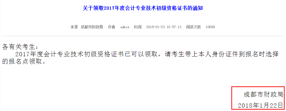2018年成都市初级会计职称考后审核已经结束近两个月啦,在这两个月的时间里,成都的考生们都在焦急等待2018年初级会计证书领取时间的公布。小编也和大家一样着急,所以为大家查找了成都市2017年的会计证书领取公告,希望能缓解一下大家焦急的情绪。