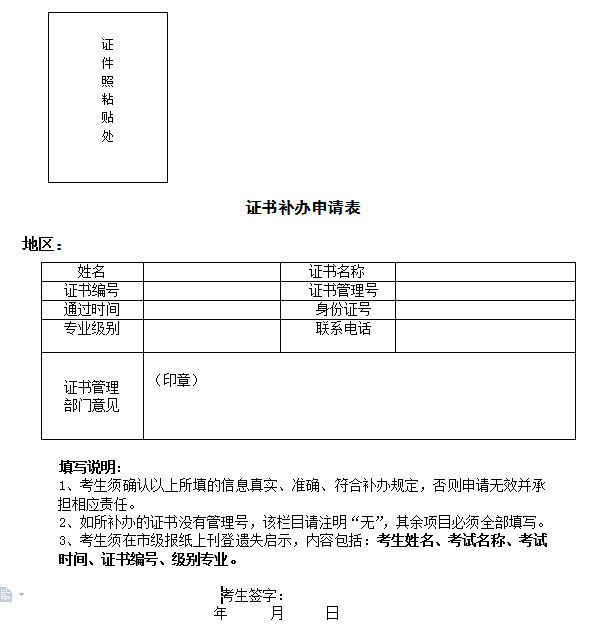 4、二张一寸白底证件照(粘贴于《证书补办申请表》右上角);
