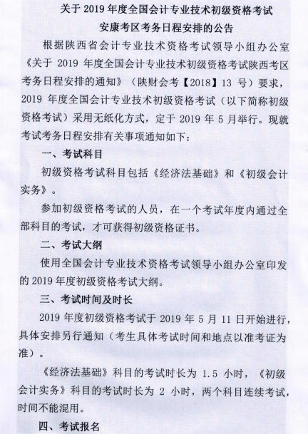 关于2019年度全国会计专业技术初级资格考试安康考区考务日程安排的公告
