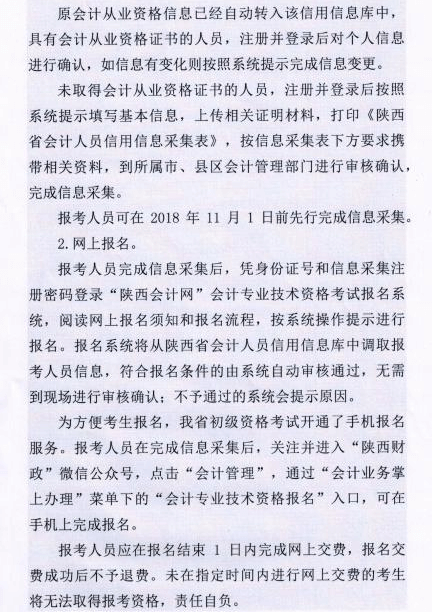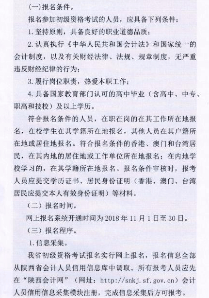 2018年11月1日-2018年11月30日为陕西安康2019年初级会计职称考试报名时间,报考人员应先在“陕西会计网”会计人员信用信息采集模块注册,完成信息采集后方可报考,具体要求如下。