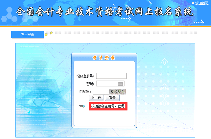 1、进入2019年初级会计职称考试官方报名入口,在“考生登录”页面点击“找回报名注册号、密码”。