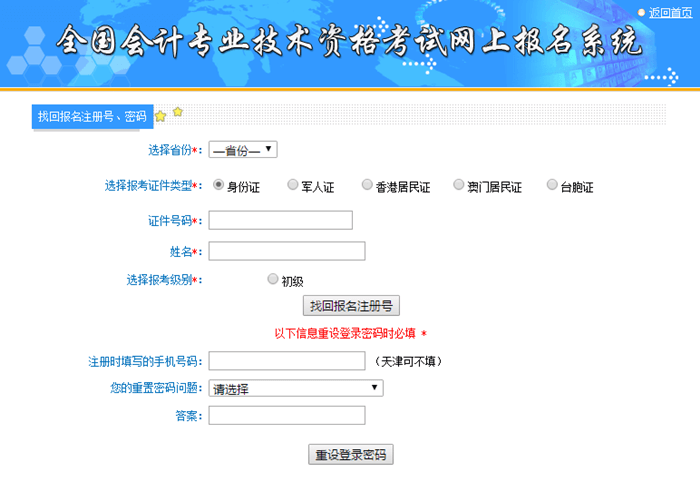 2019年初级会计职称考试全国报名入口开通时间为2018年11月1日-2018年11月30日,广大初级会计考生需按照各地报名简章规定完成会计初级考试报名。考生再次登录网上报名系统时,需要使用注册号和密码,请大家妥善保管,如果不慎忘记注册号和密码,可通过以下流程找回。