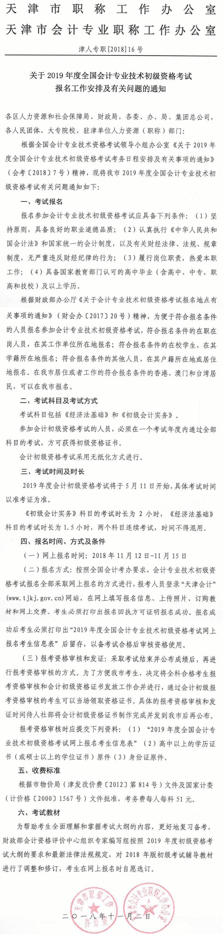 2018年11月12日-2018年11月15日为天津市2019年初级会计职称考试报名时间,采取考后资格审核的方式,请参加2019年会计初级考试的考生按照简章要求,在规定时间内完成初级会计考试报名和缴费。
