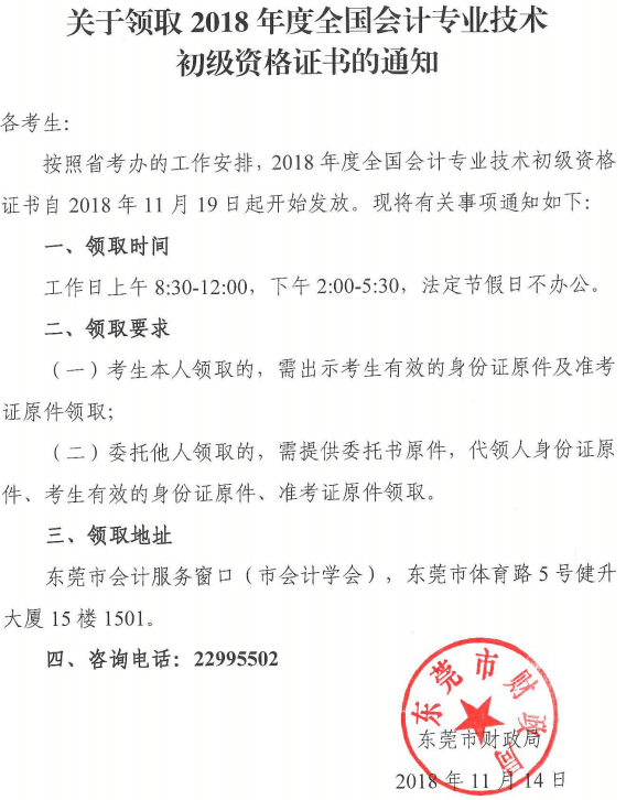 广东省东莞市2018年初级会计职称合格证书自2018年11月19日开始领取,请通过2018年初级会计考试的人员,携带身份证原件及准考证原件,到指定地点领取初级会计证书。