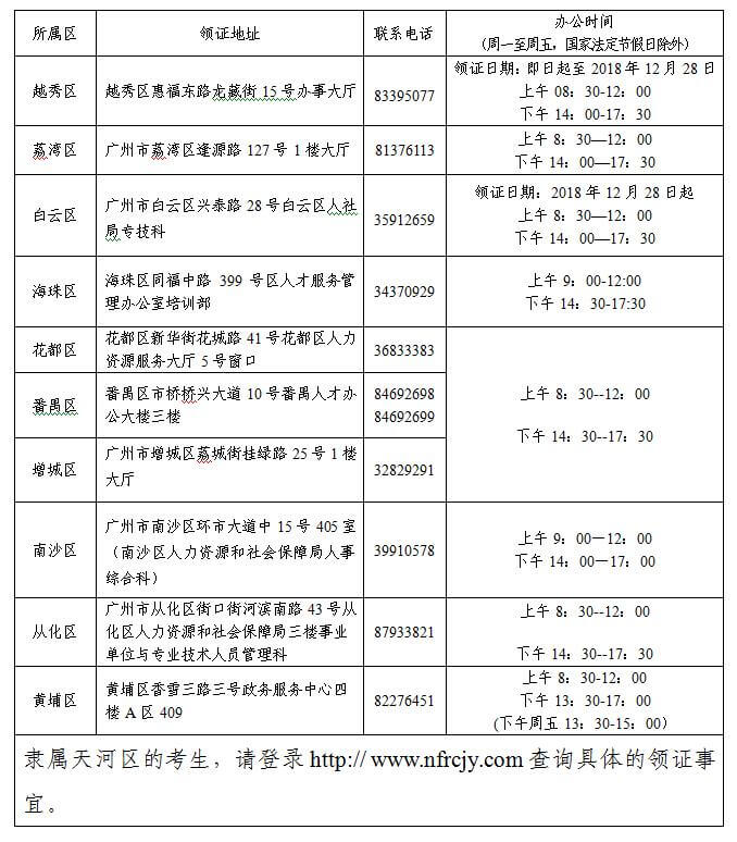 广州市2018年度全国会计专业技术初级资格证书已发至各区相关负责部门,请考生持身份证原件(代领的,需出示代领者和考生的身份证原件)按报名时隶属的区查询、领取资格证书,具体领证地址及联系方式如下: