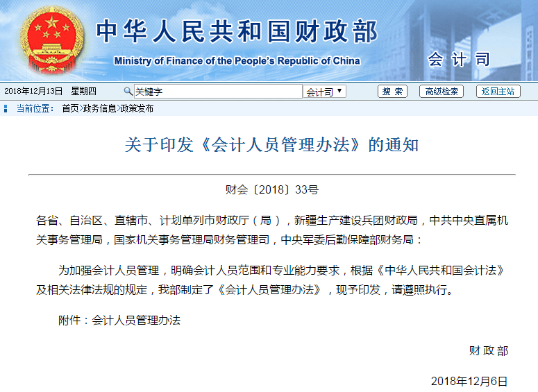 从财政部会计司获悉,从2019年1月1日起,《会计人员管理办法》将正式实施。2018年12月13日,财政部会计司有关负责人就出台《会计人员管理办法》答记者问(点击查看>>)。