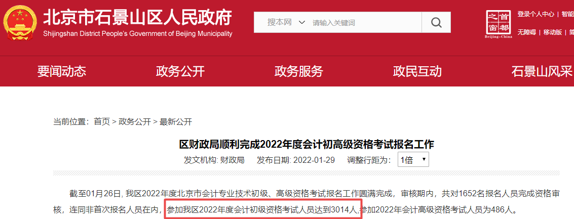 截至01月26日, 我区2022年度北京市会计专业技术初级、高级资格考试报名工作圆满完成,审核期内,共对1652名报名人员完成资格审核,连同非首次报名人员在内,参加我区2022年度会计初级资格考试人员达到3014人,参加2022年会计高级资格考试人员为486人。