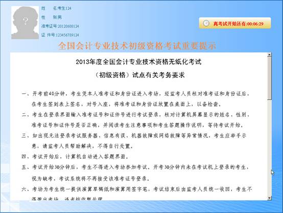 登录后,请仔细核对屏幕左上方考生基本信息,包括考生照片、姓名、性别、准考证号、证件号。个人信息核对无误后,充分利用开考前时间,认真阅读考试重要提示,提示内容包括考务要求及答题系统操作指南。