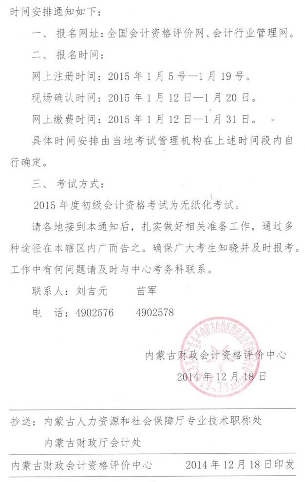内蒙古财政会计资格评价中心关于2015年全国会计专业技术资格考试报名工作时间安排的通知