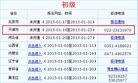 根据《关于2015年度全国会计专业技术初级资格考试报名工作安排及有关问题的通知》获悉,2015年全国会计专业技术初级资格考试网上报名时间:2015年1月19至23日,报考人员登录“天津会计”(www.tjkj.gov.cn)网站报名。