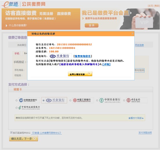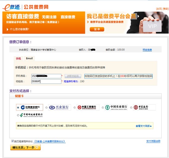 7、界面将跳转到“E缴通平台”进行手机验证和选择支付方式(银行选择);