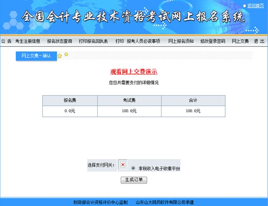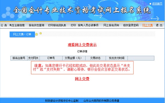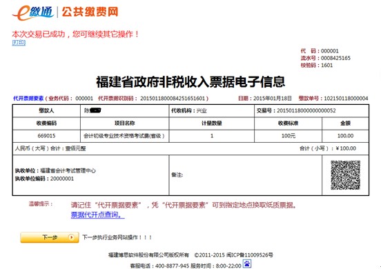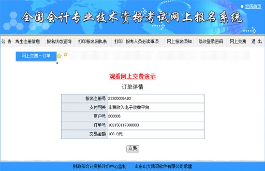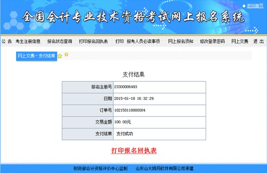 13、点击“下一步”跳转回到会计报名系统查看支付结果和打印报名回执表。