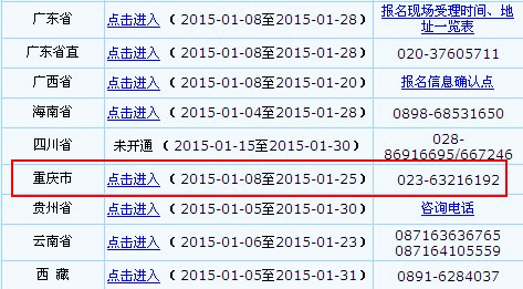 根据《2015年度重庆市会计专业技术初、中级资格考试报名简章》获悉,重庆2015年初级资格考试网上报名时间为1月8日至1月25日,现场资格审核和网上缴费时间为1月15日至1月26日(节假日除外)。报考人员点击登录“全国会计资格评价网”、“重庆会计之家”网站首页点击会计初级会计资格考试“网上报名”系统,自行填报考试信息,并打印“网上报名考生信息表”。